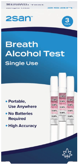 Stay safe and confident with the 2San® Breath Alcohol Test. This handy single-use device lets you check for alcohol on your breath quickly and easily. No calibration is required and no batteries are needed. Just breathe into it and get clear, accurate results after only 4 minutes.